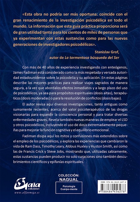 Con más de 40 años de experiencia investigando con enteógenos, James Fadiman está considerado como la más respetada y versada autoridad estadounidense sobre la psicodelia y su aplicación. En estas páginas describe las mejores prácticas para realizar viajes sagrados de manera segura, a la vez que abordalos efectos inmediatos y a largo plazo del uso de psicodélicos, ya sea para propósitos espirituales (dosis altas), terapéuticos (dosis moderadas) o para la resolución de conflictos (dosis bajas). El autor revisa aquí diversas investigaciones, tanto antiguas como sumamente recientes, acerca del valor psicoterapéutico de las drogas visionarias para expandir la consciencia personal y para tratar diversas enfermedades graves. Revela también nuevas maneras de emplear el LSD y otros psicodélicos, incluyendo el uso de dosis extremadamente pequeñas para mejorar la función cognitiva y el equilibrio emocional. Fadiman disipa aquí los mitos y confusiones más extendidos sobre el empleo de los psicodélicos, y explora las experiencias que cambiaron la vida de Ram Dass, Timothy Leary, Aldous Huxley y Huston Smith, así como las de Francis Crick y Steve Jobs, mostrando que, utilizadas sabiamente, estas sustancias pueden producir no solo curaciones sino también descubrimientos científicos y epifanías espirituales.