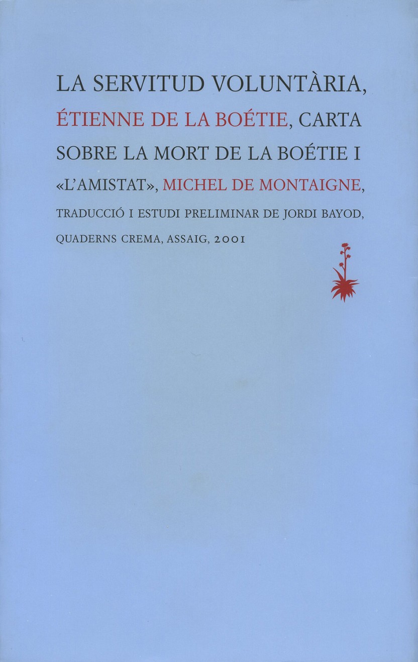 «Només vull entendre com pot ser que tants homes, tantes viles, tantes ciutats i tantes nacions suportin, algunes vegades, un tirà sol que no té altre poder que el que ells mateixos li donen...» Així comença l’anàlisi que Étienne de La Boétie fa de les relacions de dominació i servitud que s’estableixen no solament en l’àmbit social o estatal, sinó també en l’aspecte més íntim de determinats lligams personals: la servitud dels pobles—i aquí rau el seu caràcter innovador—és voluntària. Dos textos de Michel de Montaigne, íntim amic de La Boétie, completen en el volum que avui presentem el perfil personal i intel·lectual de l’autor d’aquest discurs filosòfic i polític encara vigent als nostres dies.