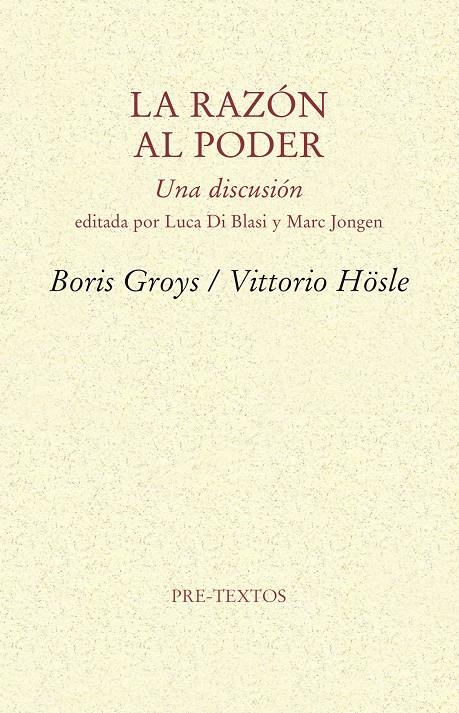 La razón al poder es el título del texto de la transcripción (revisada posteriormente por sus protagonistas) de un debate entre Vittorio Hösle y Boris Groys celebrado bajo el título de ?La razón al poder. Una disputa sobre el poder de la filosofía, el experimento del comunismo, el retorno de la religión y la legitimidad del capitalismo?. Tuvo lugar en el patio principal de la Escuela Superior de Diseño de Karlsruhe el 23 de mayo de 2007. Sus organizadores y moderadores, Marc Jongen y Luca di Blasi, introducen brevemente la discusión y la mantienen con preguntas a ambos participantes. Además, el lector español encontrará al final del texto principal un ?Comentario de los editores? en el que Jongen y Di Blasi hacen un balance ?amplio y esclarecedor? del diálogo mantenido por Groys y Hösle.