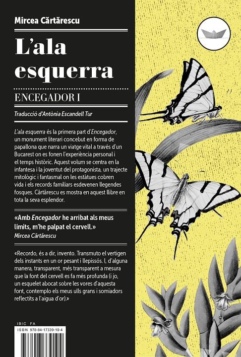 L’ala esquerra és la primera part d’Encegador, un monument literari concebut en forma de papallona que narra un viatge vital a través d’un Bucarest on es fonen l’experiència personal i el temps històric. Aquest volum se centra en la infantesa i la joventut del protagonista, un trajecte mitològic i fantasmal on les estàtues cobren vida i els records familiars esdevenen llegendes fosques. Cartarescu es mostra en aquest llibre en tota la seva esplendor.