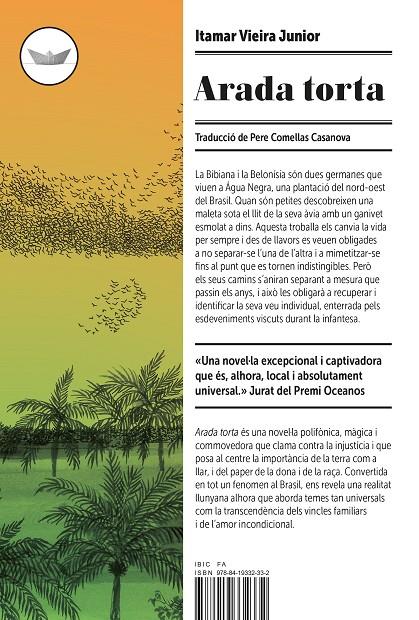 "La Bibiana i la Belonísia són dues germanes que viuen a Água Negra, una plantació del nord-oest del Brasil. Quan són petites descobreixen una maleta sota el llit de la seva àvia amb un ganivet esmolat a dins. Aquesta troballa els canvia la vida per sempre i des de llavors es veuen obligades a no separar-se l’una de l’altra i a mimetitzar-se fins al punt que es tornen indistingibles. Però els seus camins s’aniran separant a mesura que passin els anys, i això les obligarà a recuperar i identificar la seva veu individual, enterrada pels esdeveniments viscuts durant la infantesa. Arada torta és una novel·la polifònica, màgica i commovedora que clama contra la injustícia i que posa al centre la importància de la terra com a llar, i del paper de la dona i de la raça. Convertida en tot un fenomen al Brasil, ens revela una realitat llunyana alhora que aborda temes tan universals com la transcendència dels vincles familiars i de l’amor incondicional."